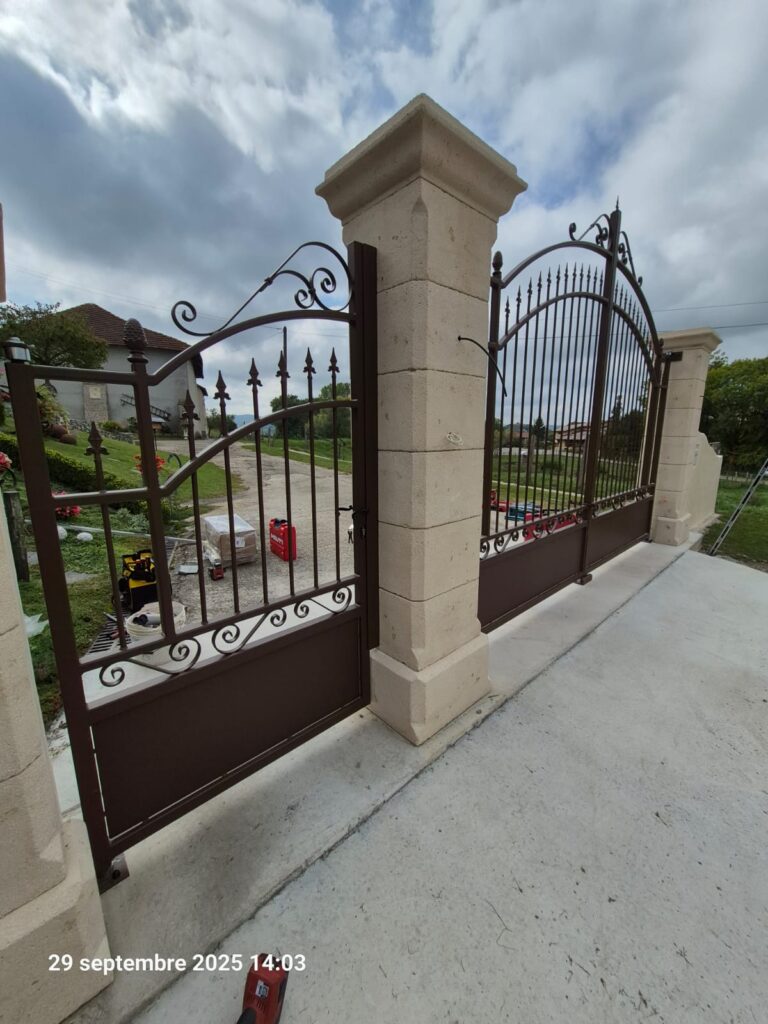 Nous venons récemment de réaliser un magnifique ensemble portail + portillon entièrement fabriqué en acier. Conçu dans un style traditionnel avec chapeau de gendarme, volutes élégantes et fers de lance esthétiques, cet ouvrage illustre parfaitement l’importance d’un portail bien pensé :