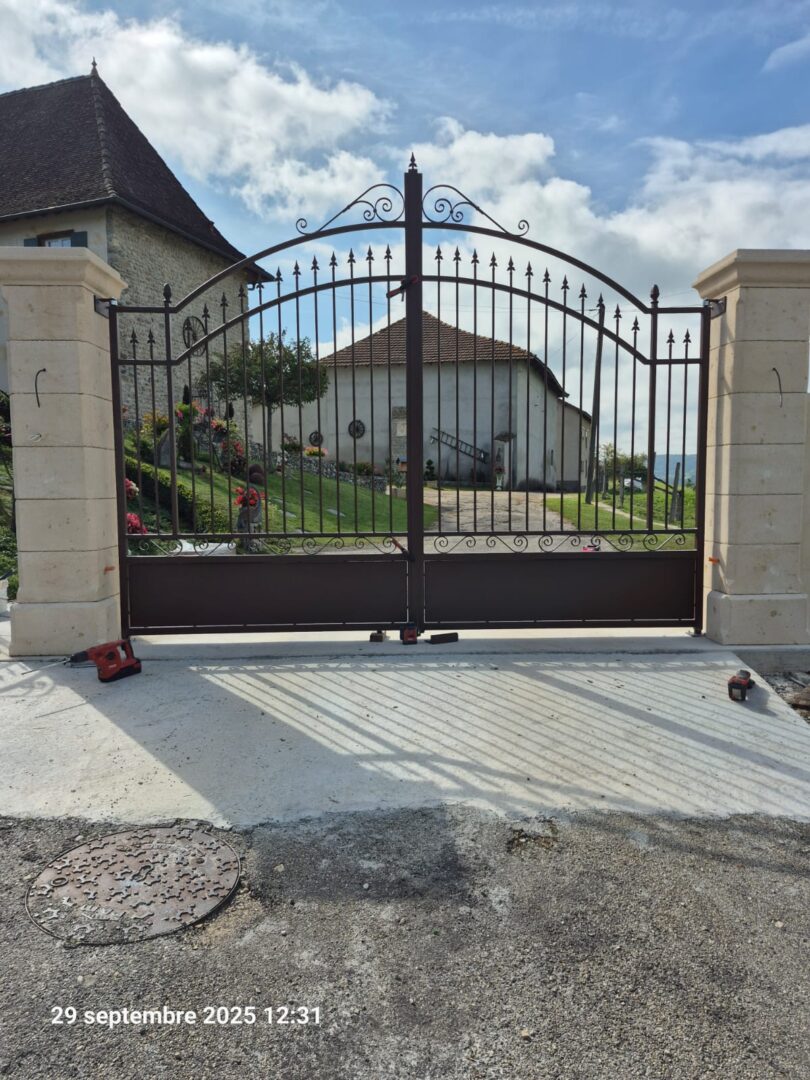 Nous venons récemment de réaliser un magnifique ensemble portail + portillon entièrement fabriqué en acier. Conçu dans un style traditionnel avec chapeau de gendarme, volutes élégantes et fers de lance esthétiques, cet ouvrage illustre parfaitement l’importance d’un portail bien pensé :